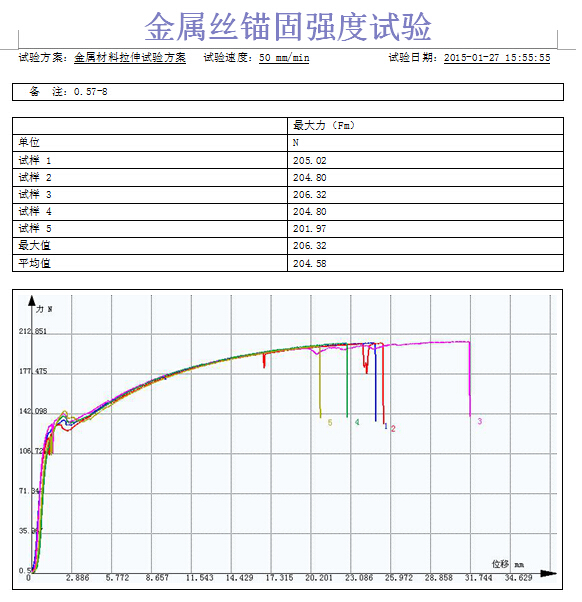 成功的實驗,最大值出現在金屬絲脫離線耳或者金屬絲中間發(fā)生斷裂,請看下圖。最后還給出一組合格的測試報告。