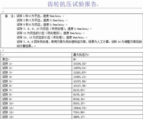 該客戶是一家粉末冶金專業(yè)制造企業(yè),該客戶目前主要生產(chǎn)鐵系、銅系、合金系等高精度含油軸承及以鐵基、銅基、合金、不銹鋼為原材料的高強(qiáng)度結(jié)構(gòu)零件,其產(chǎn)品主要用于汽車、摩托車、家用電器、辦公設(shè)備、電動工具、鎖具及園林工具等多個(gè)行業(yè)。齒輪就是輪緣上有齒能連續(xù)嚙合傳遞運(yùn)動和動力的機(jī)械元件,齒輪是能互相嚙合的有齒的機(jī)械零件,它在機(jī)械傳動及整個(gè)機(jī)械領(lǐng)域中的應(yīng)用極其廣泛。齒輪及其齒輪產(chǎn)品是機(jī)械裝備的重要基礎(chǔ)件,絕大部分機(jī)械成套設(shè)備的主要傳動部件都是齒輪傳動。就目前的齒輪市場從規(guī)模和銷售額等各方面因素來看,齒輪產(chǎn)業(yè)已然成為中國機(jī)械通用零部件基礎(chǔ)件領(lǐng)域的“領(lǐng)軍”級行業(yè)。中國已經(jīng)成為名副其實(shí)的世界齒輪制造大國,市場發(fā)展前景廣闊!此次該客戶委托我司做了金屬齒輪的抗壓試驗(yàn)方案,如下的相關(guān)試驗(yàn)數(shù)據(jù)及參數(shù)是用我們?nèi)继┙莸脑囼?yàn)機(jī)設(shè)備試驗(yàn)得出的結(jié)果: